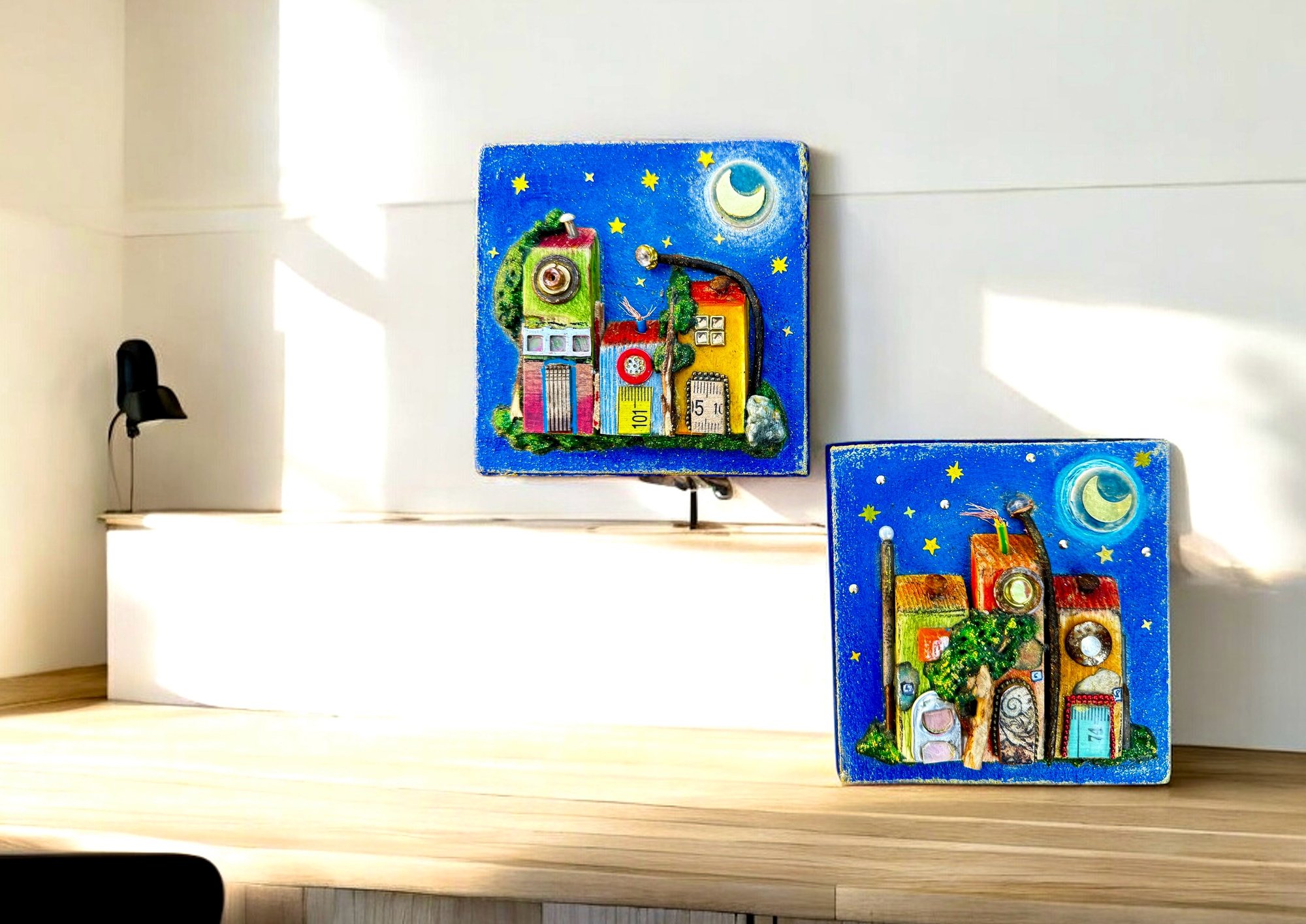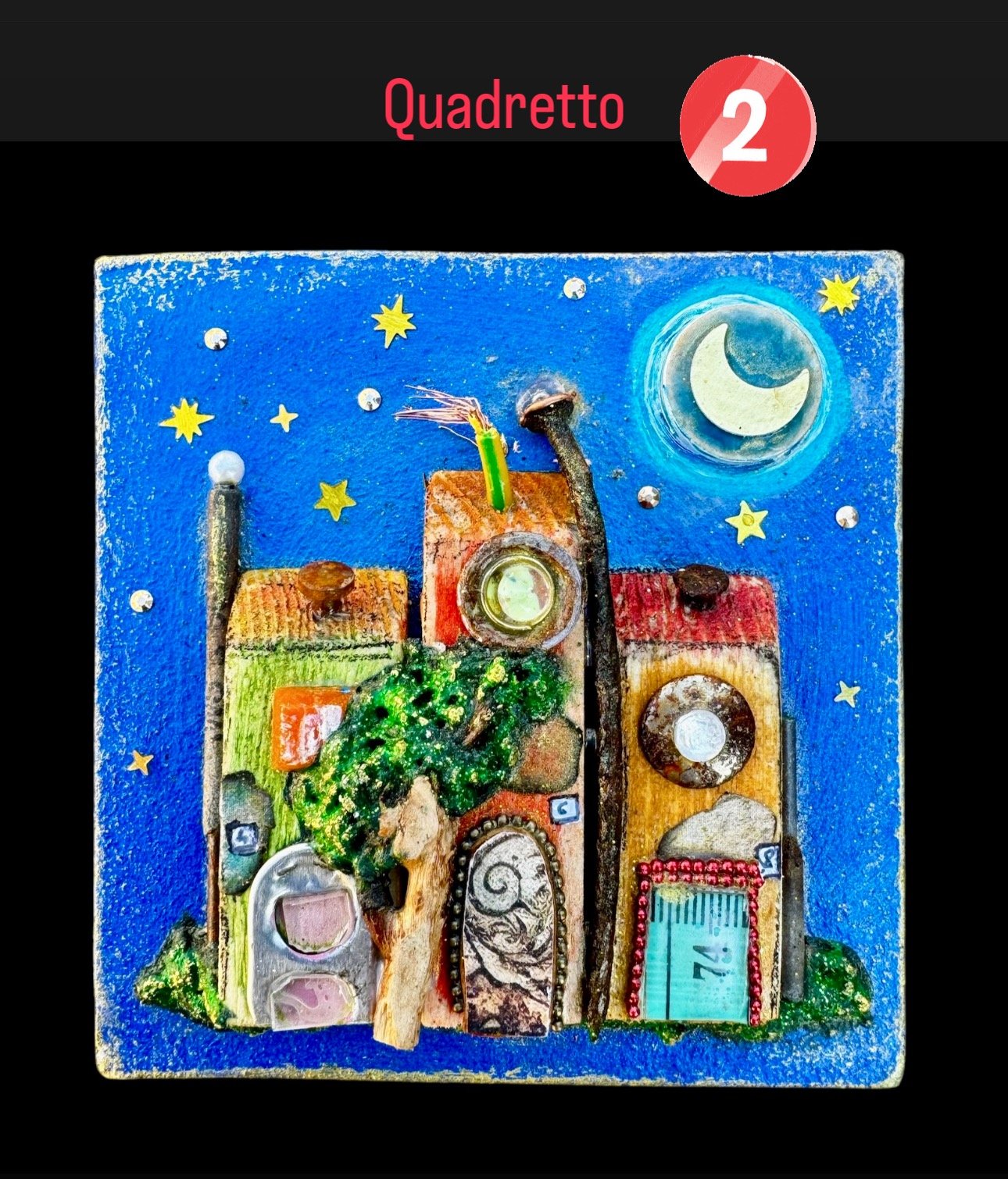 Mini borghetti nella mia tecnica di assemblaggio dove unisco i più svariati materiali di recupero . Ognuno è un piccolo pezzo unico con dettagli assolutamente originali e divertenti . Ogni dettaglio è curato con la passione per la ricerca, e rimanda alle porte, ai bandoni delle botteghe, alle finestrelle colorate che hanno reso alcuni dei nostri borghi italiani famosi in tutto il mondo.