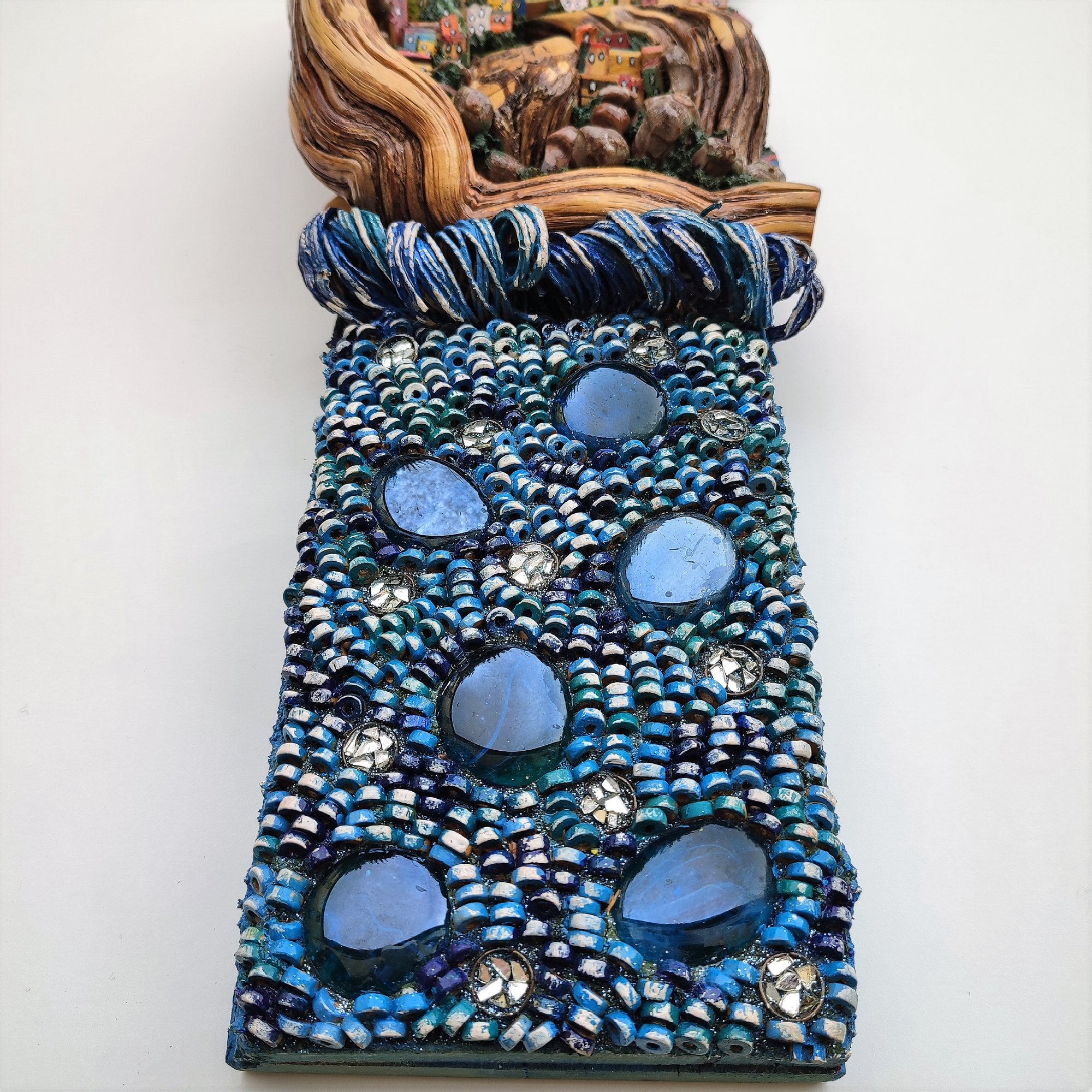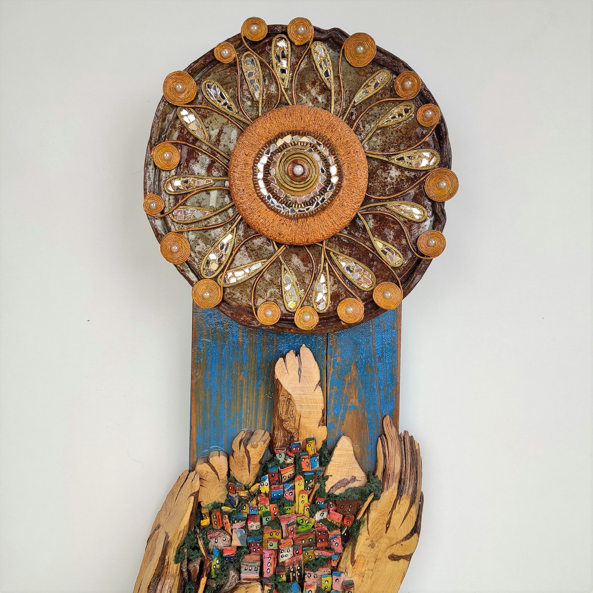 The panel represents an island with a village embraced in a cliff that looks like soft and wrapping bird wings. The sun is made in my mosaic in a multi-material technique with a metal base and mosaic inserts of mirrors and accessories. The village is all made of wood, the sea is a mix of wood, glass and twine.