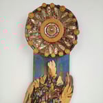 Pannello verticale in tecnica mista di mosaico ed assemblaggio legno , vetro, metallo e legno di recupero.