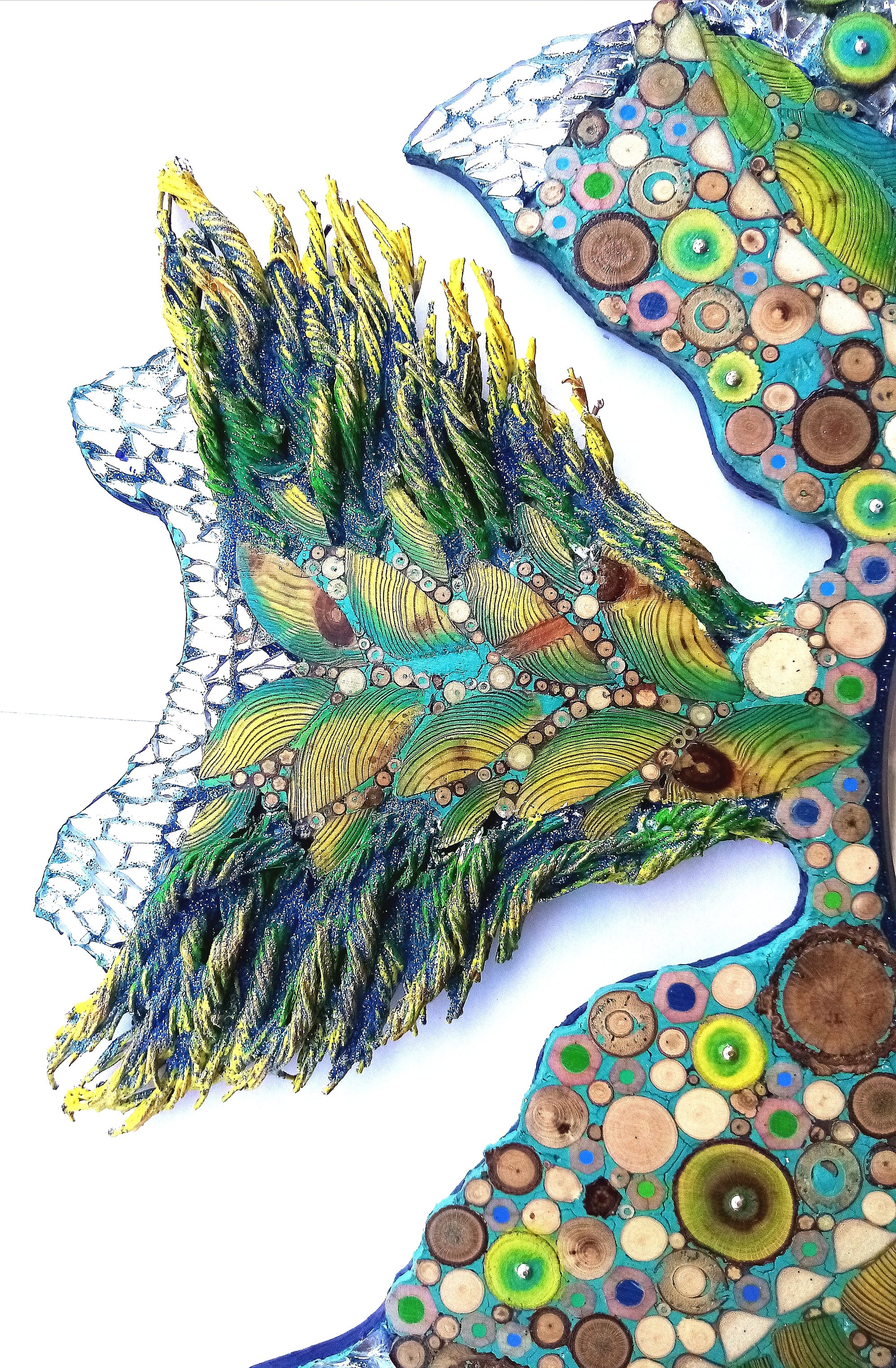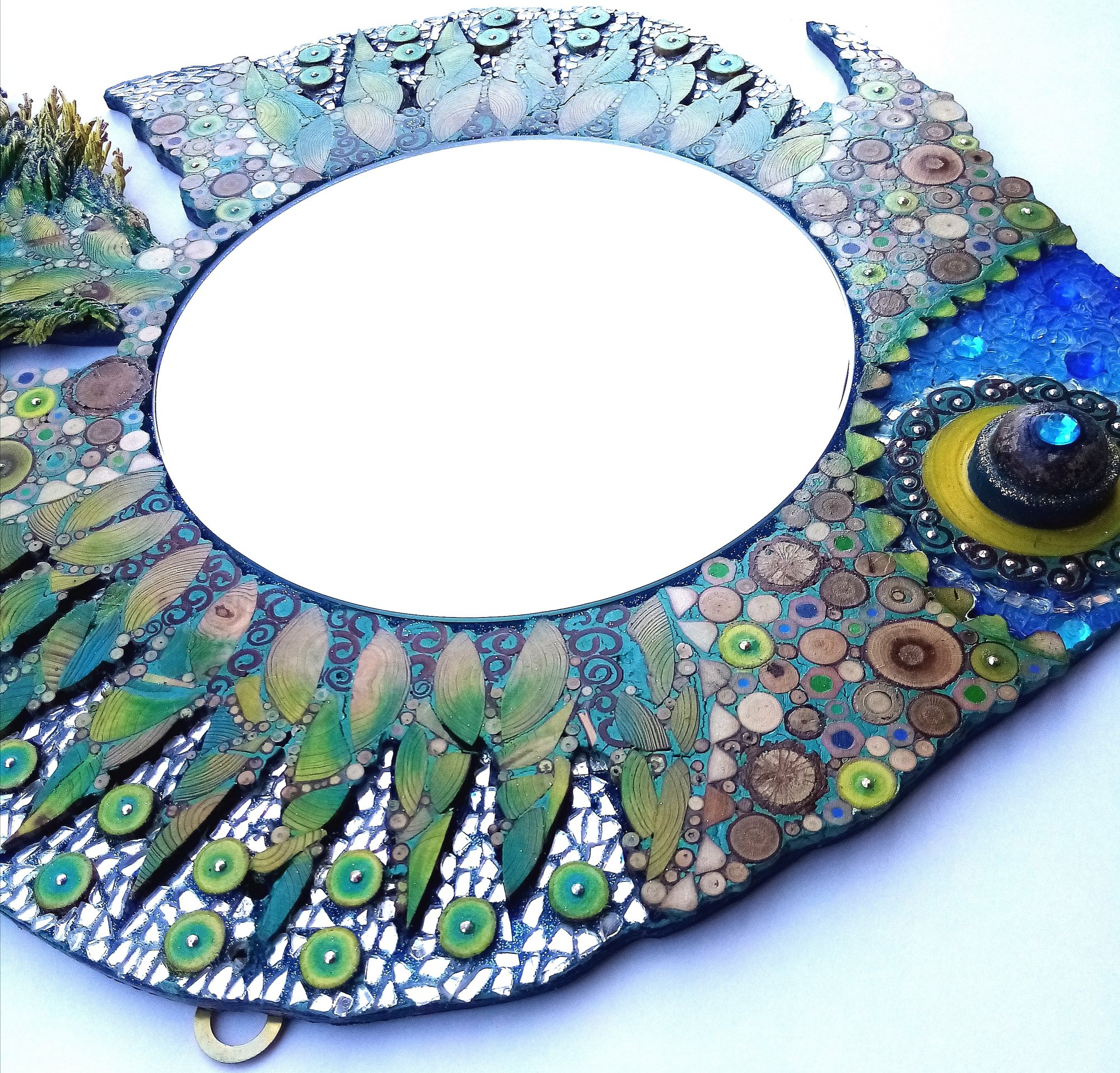 ENG: A mirror shaped as fish and decorated in my mosaic technique that includes sections of wood and colored pencils juxtaposed with glass, mirrors, metal accessories, expertly worked rope for the tail. The colors, the play of lights created by the colored glass mosaic and mirrors in the ends of the fins and the flowing tail, give this piece life and movement that will immediately be noticed on your walls! Sizes 45x53x2.5 cm